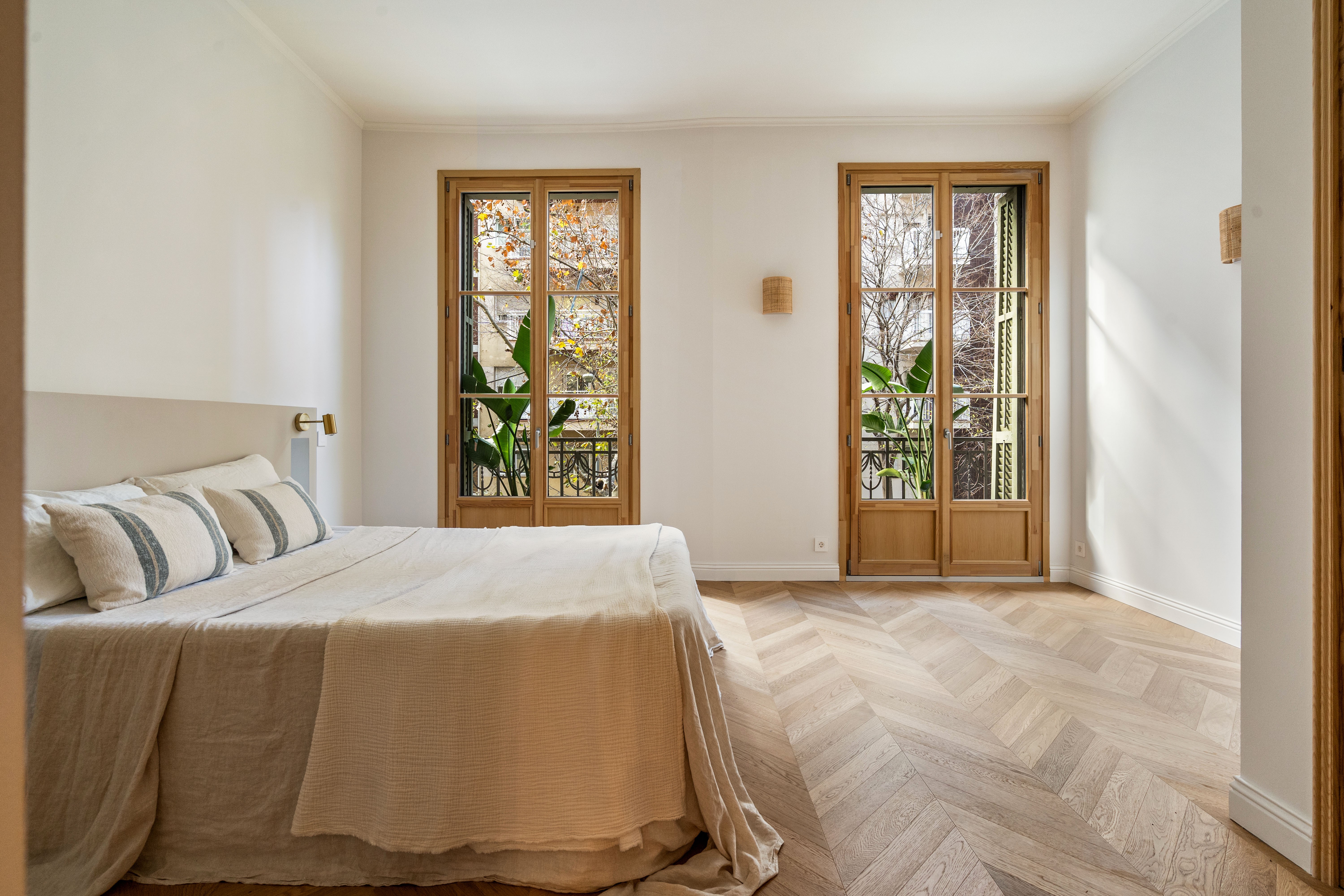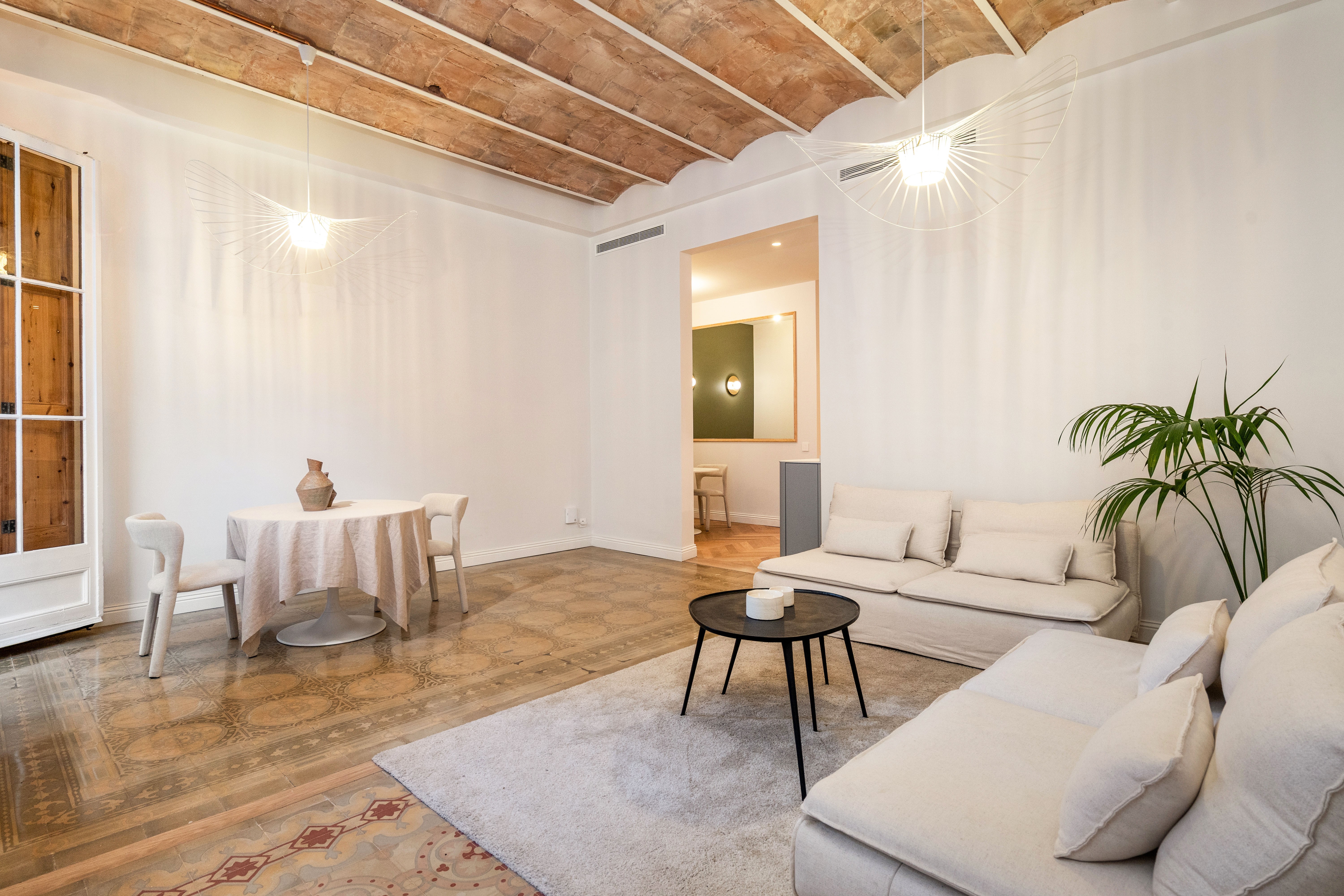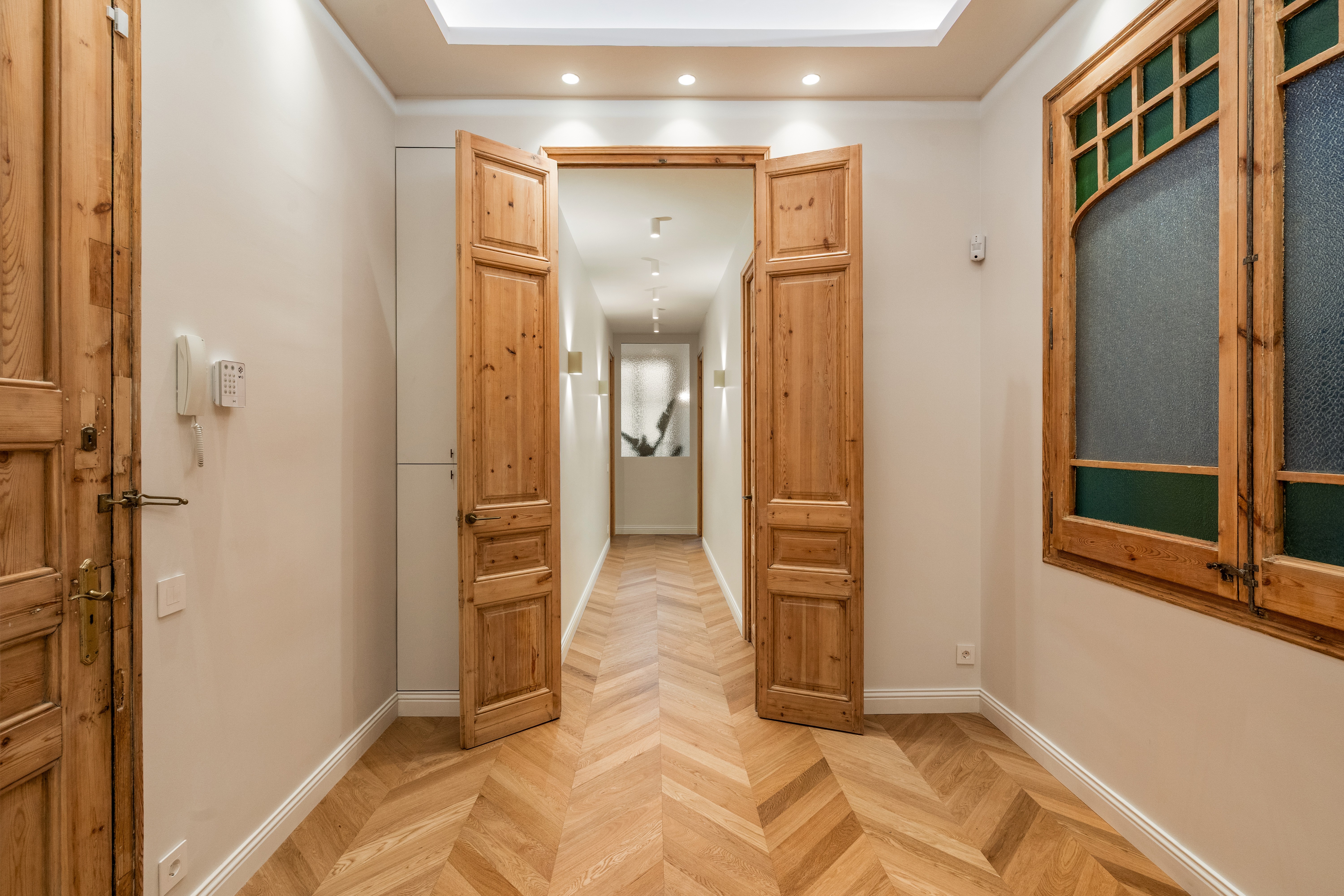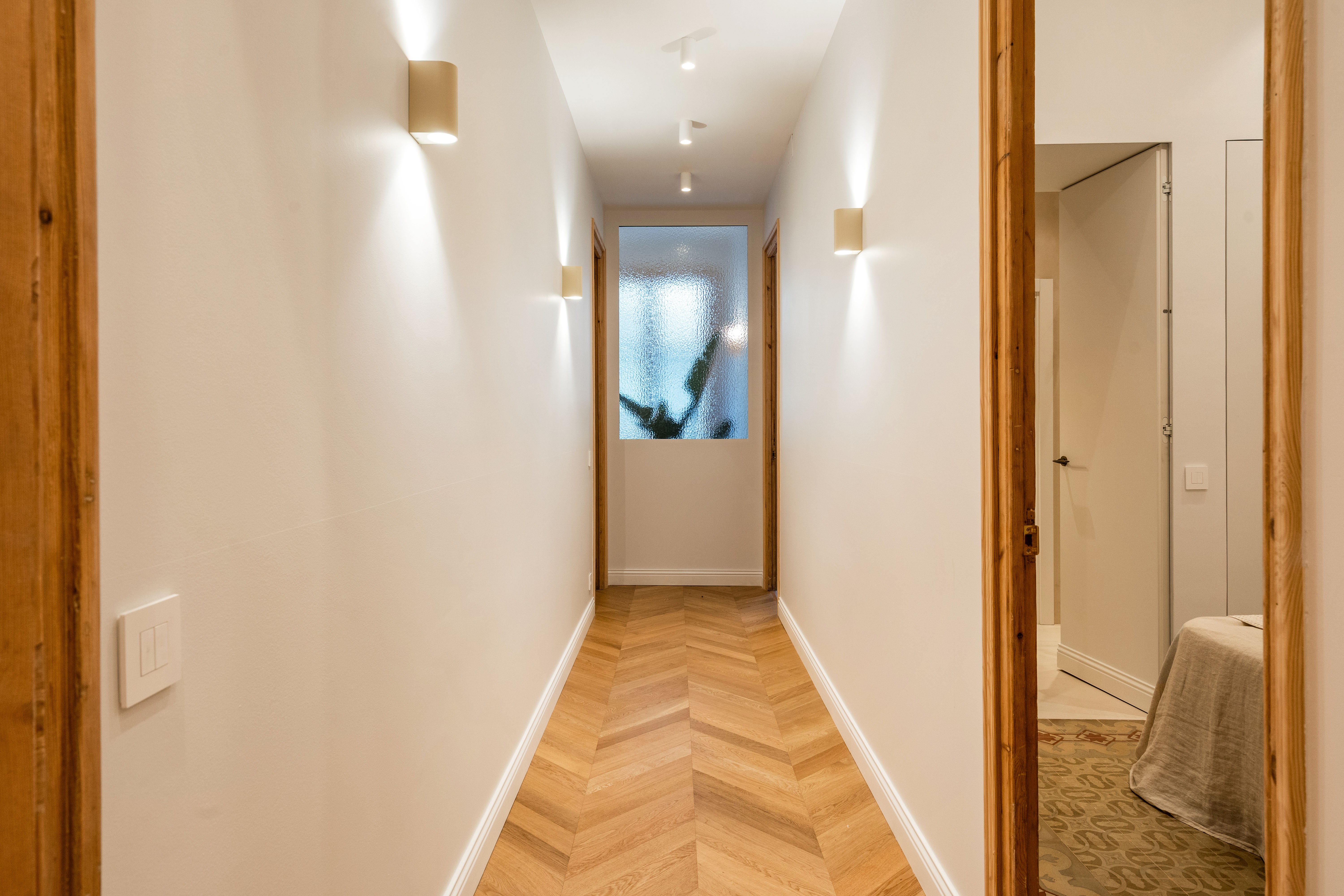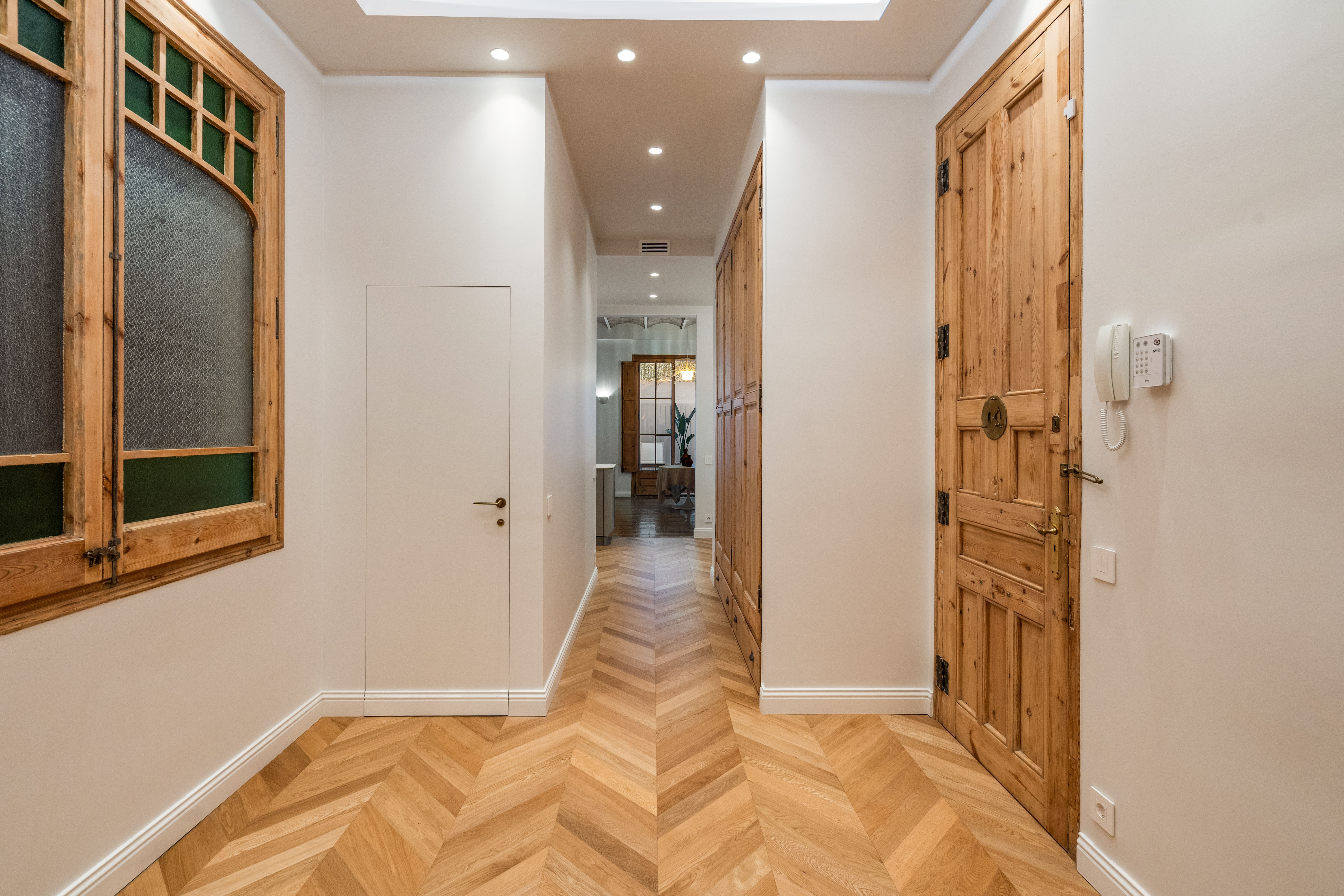 La vivienda, completamente renovada a estrenar, conserva el carácter clásico propio de las fincas regias de los años 20, gracias a los suelos hidráulicos originales recuperados, los techos de 3.40 cm con bóveda catalana, los suelos de madera en espiga y a los grandes ventanales típicos de l’Eixample, ahora con doble acristalamiento, que aportan personalidad y elegancia.