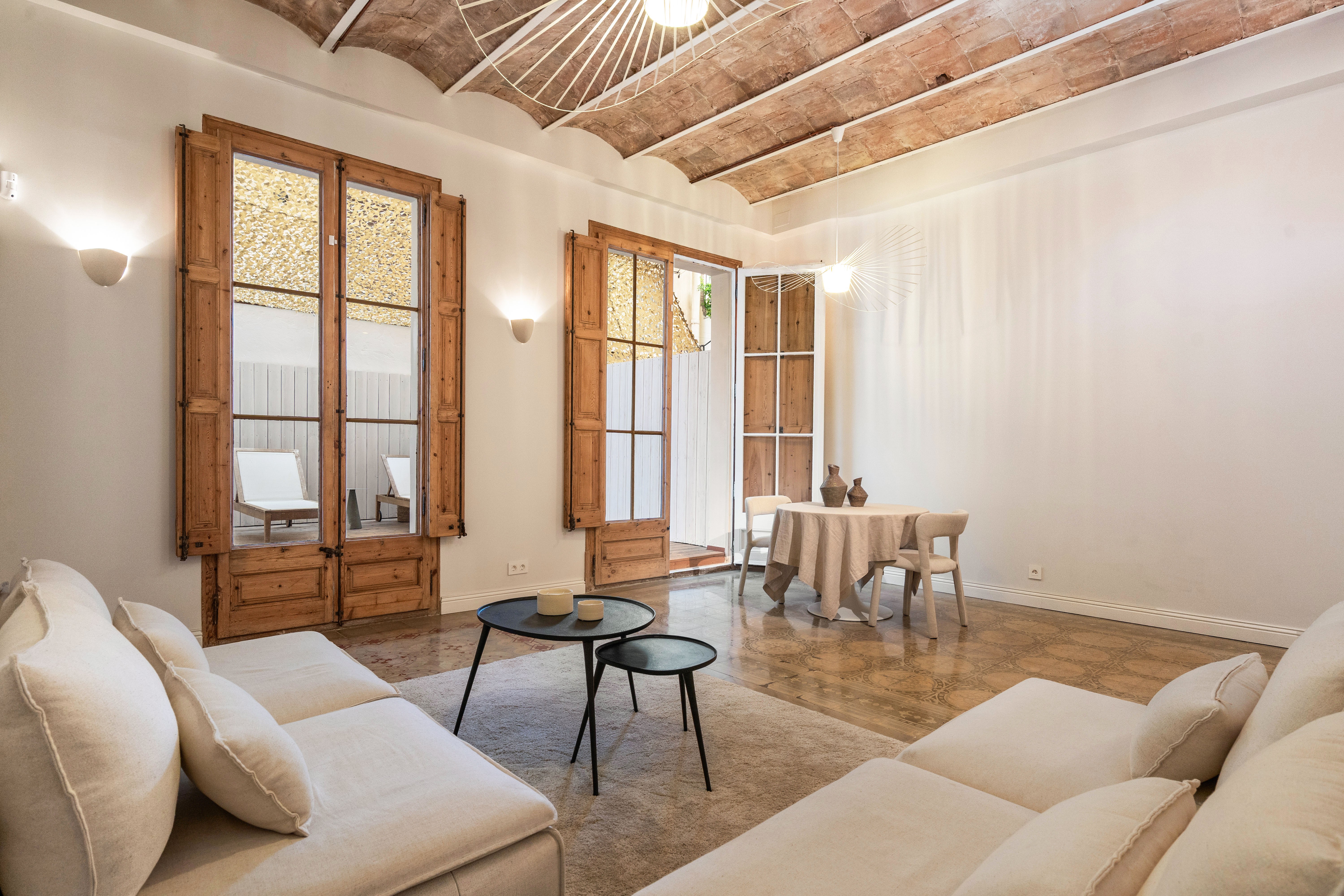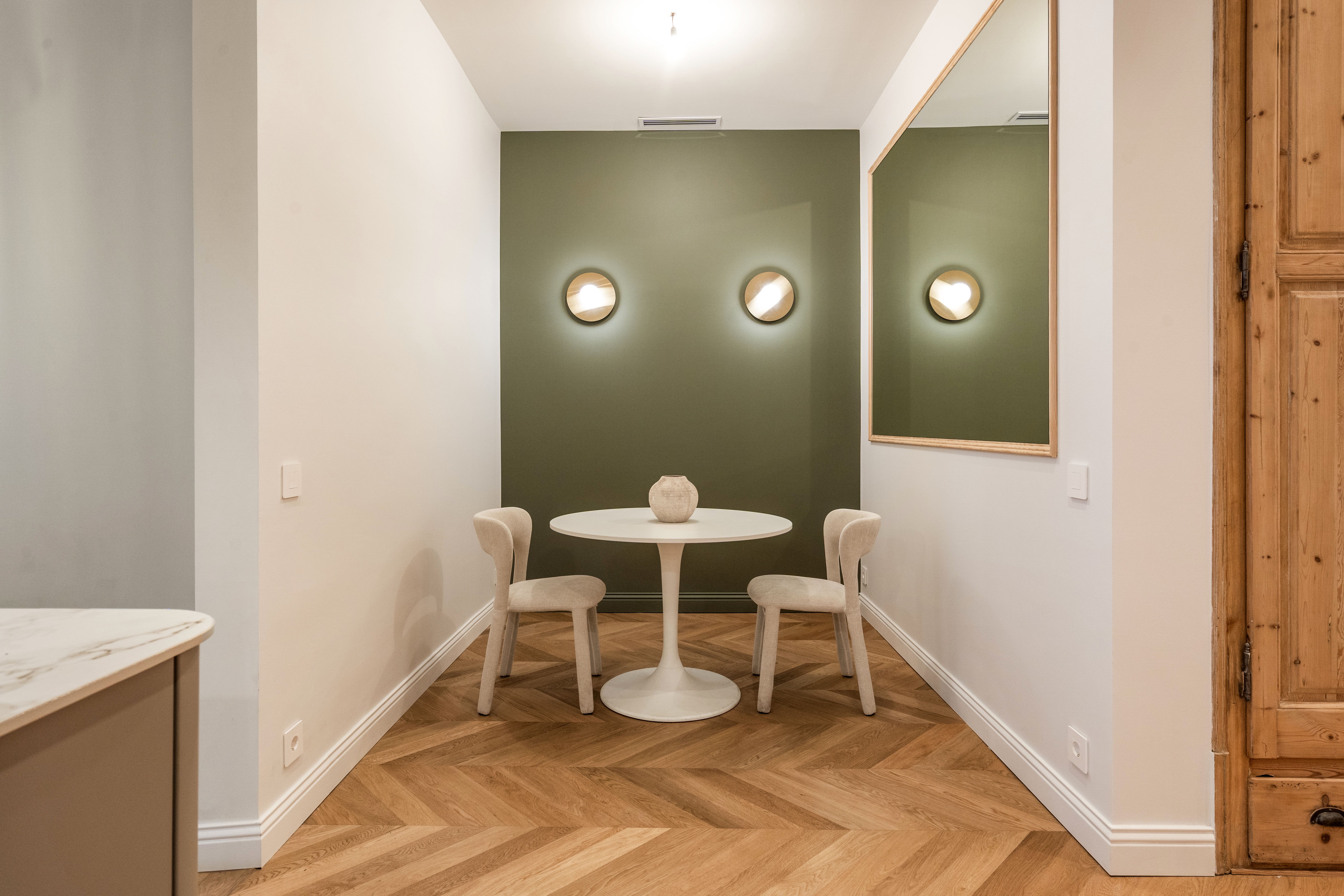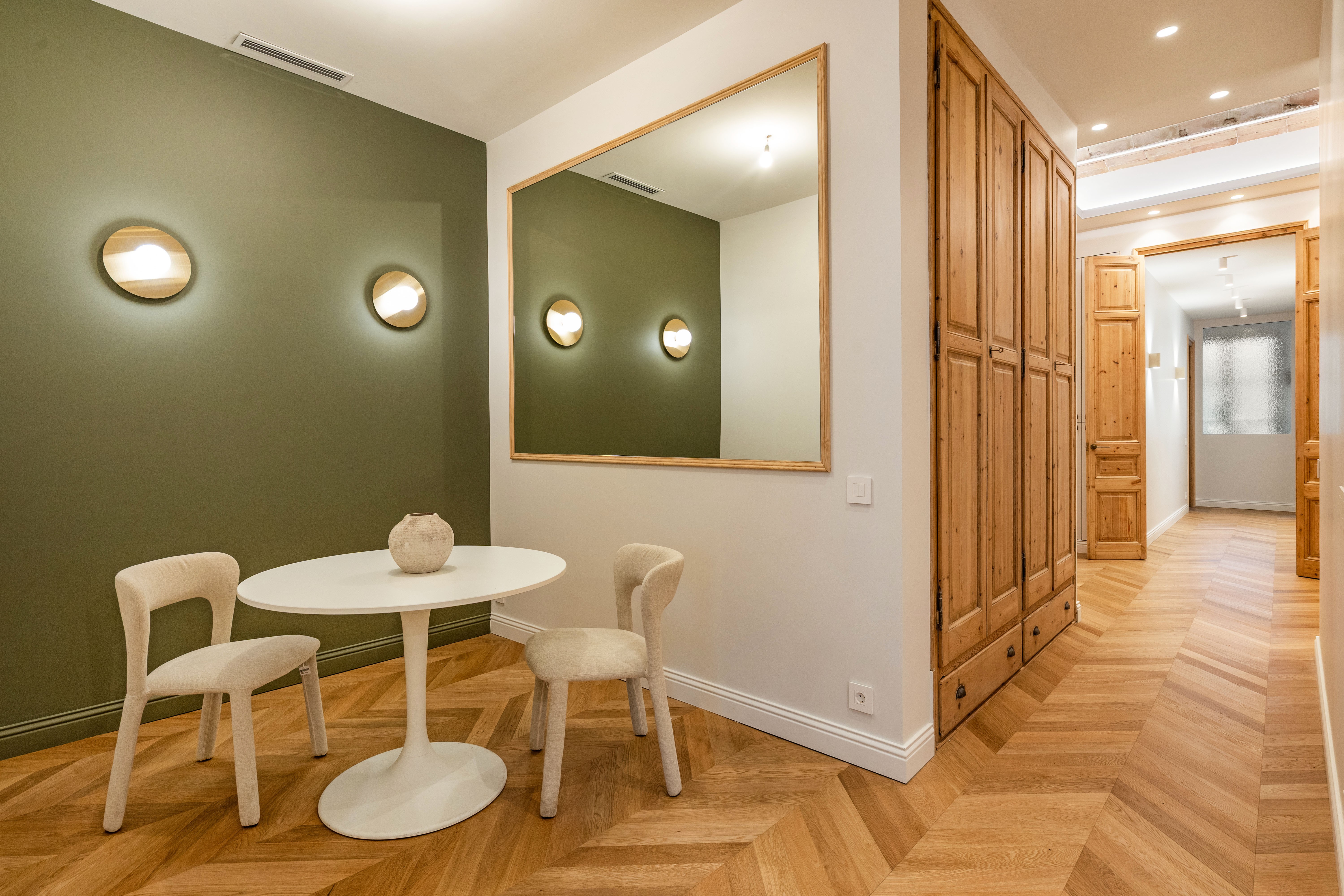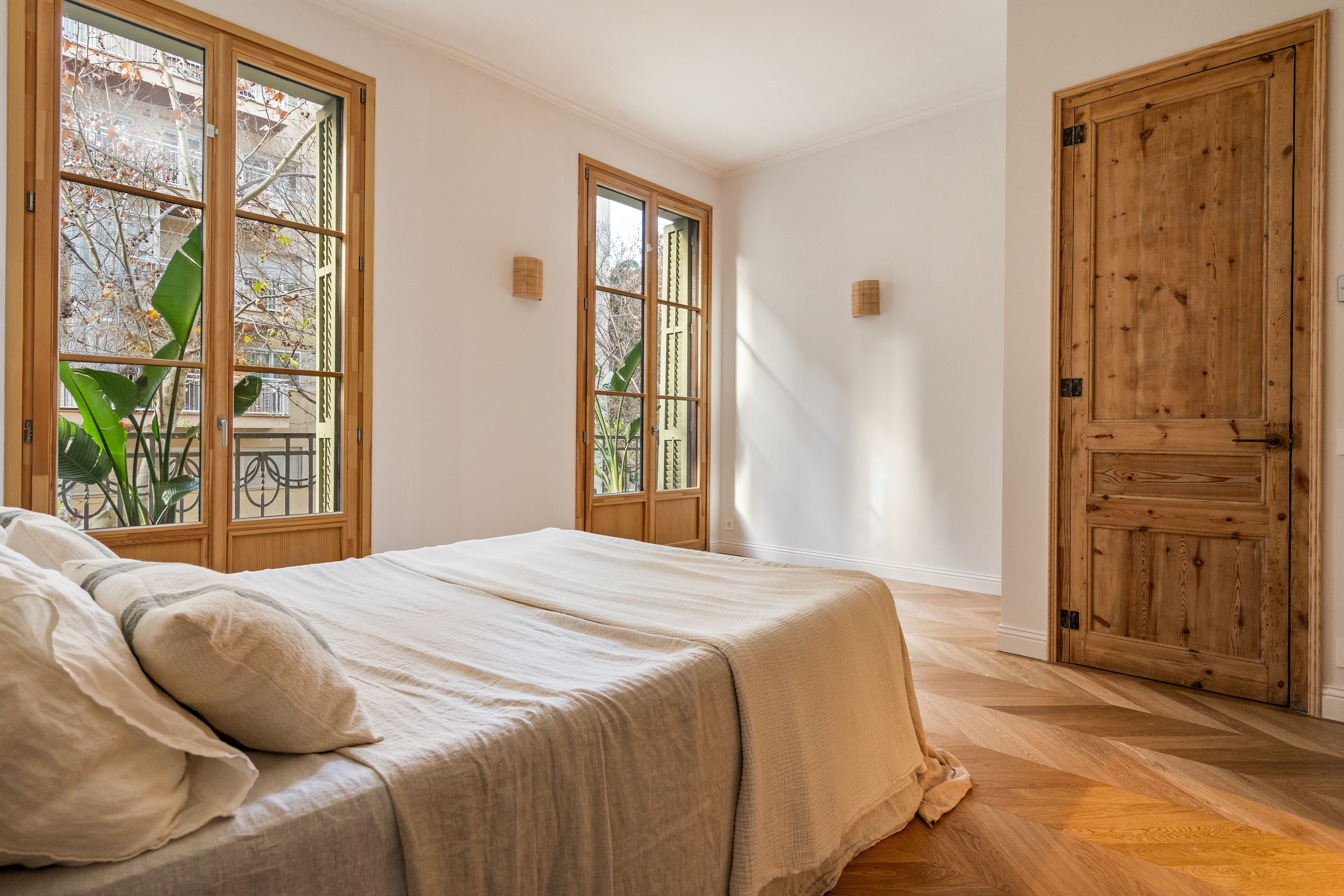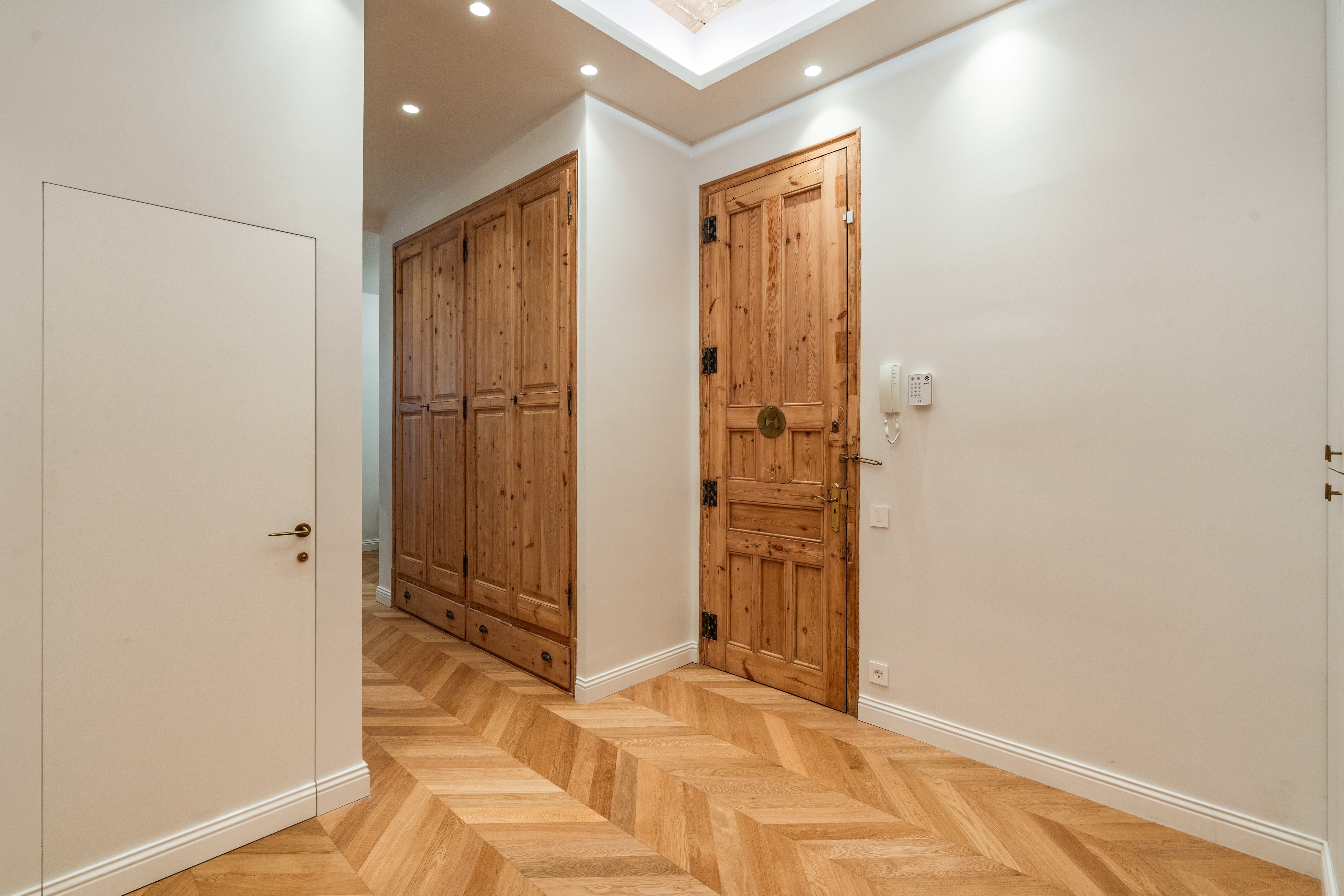 La vivienda, completamente renovada a estrenar, conserva el carácter clásico propio de las fincas regias de los años 20, gracias a los suelos hidráulicos originales recuperados, los techos de 3.40 cm con bóveda catalana, los suelos de madera en espiga y a los grandes ventanales típicos de l’Eixample, ahora con doble acristalamiento, que aportan personalidad y elegancia.