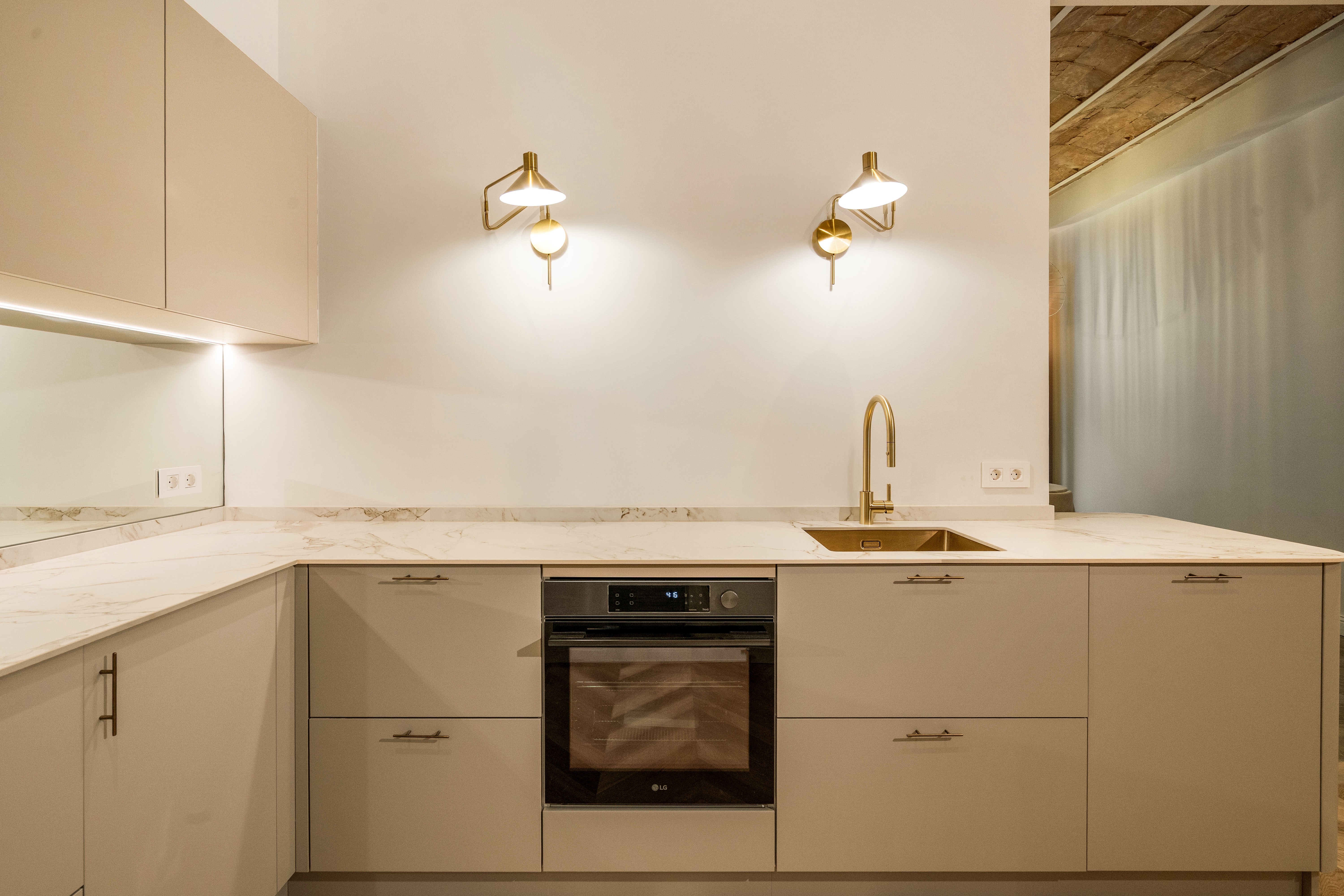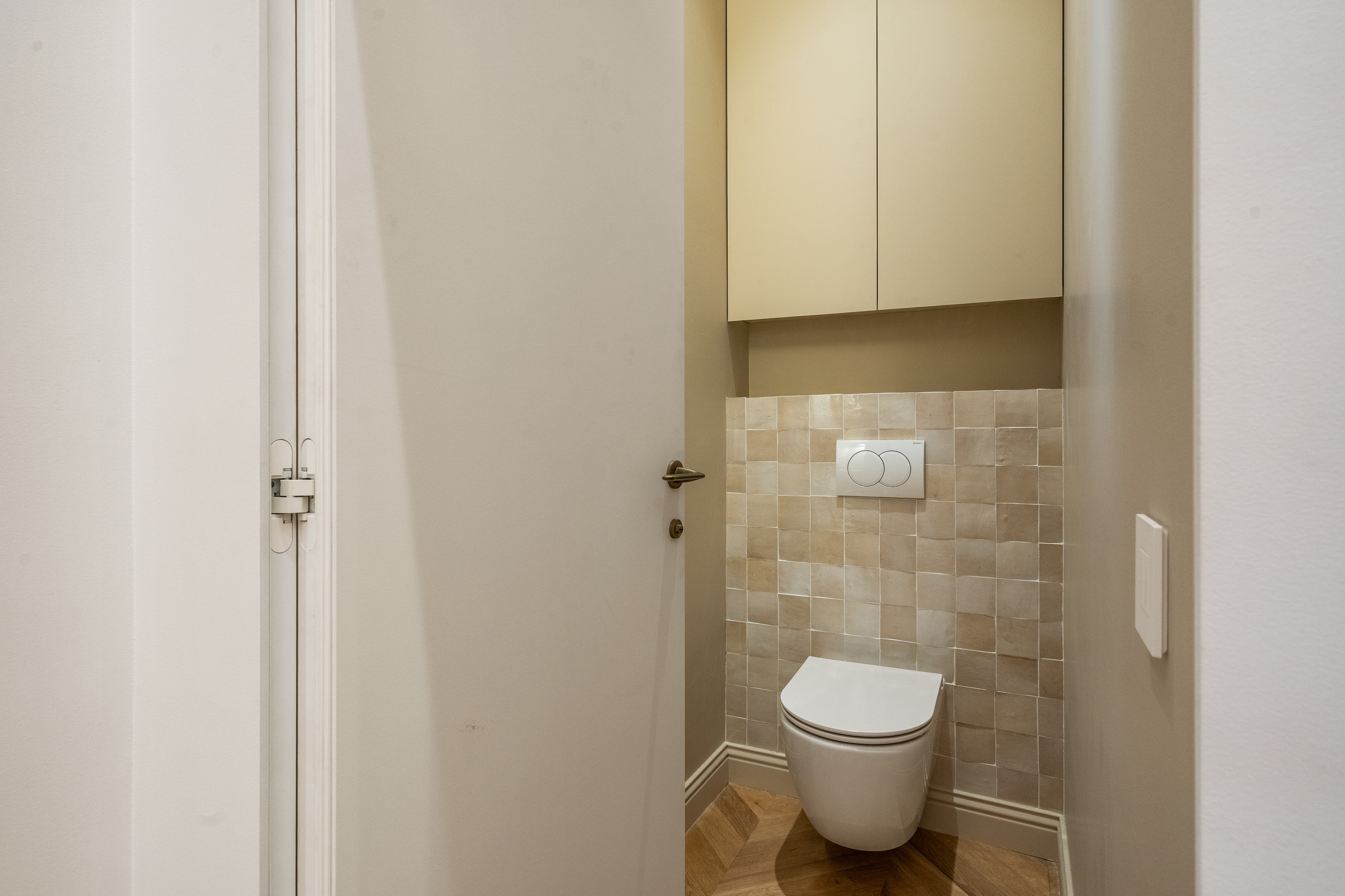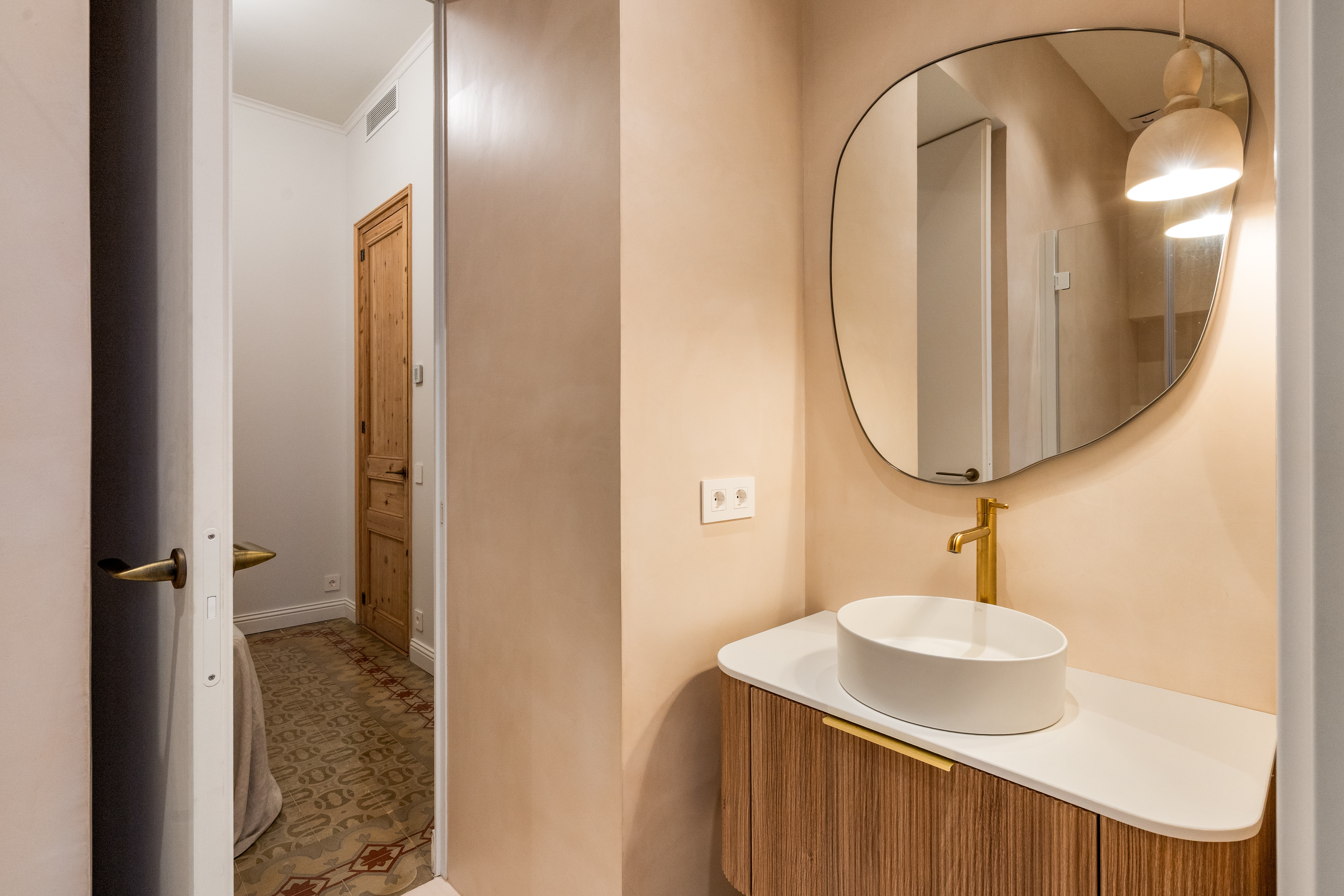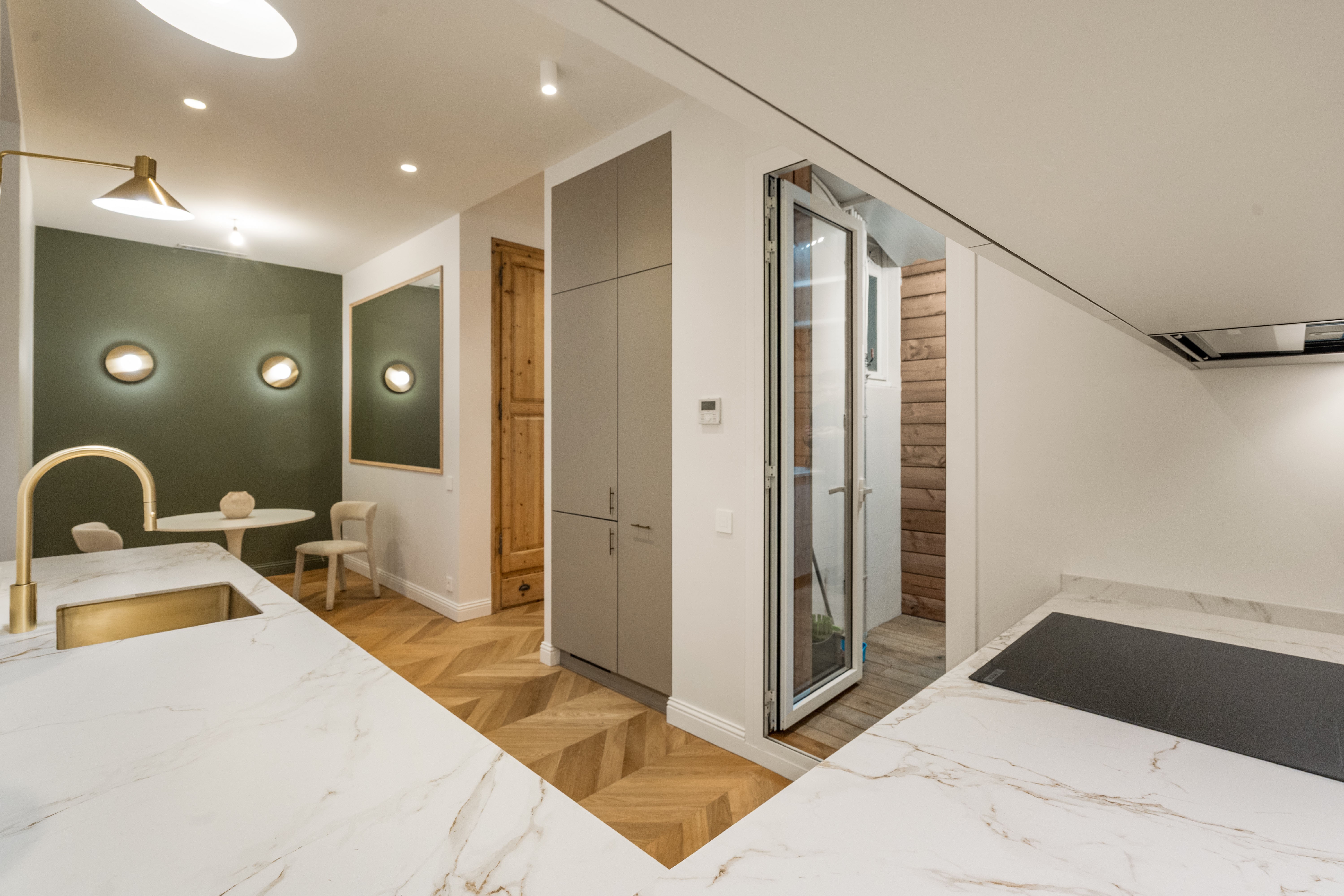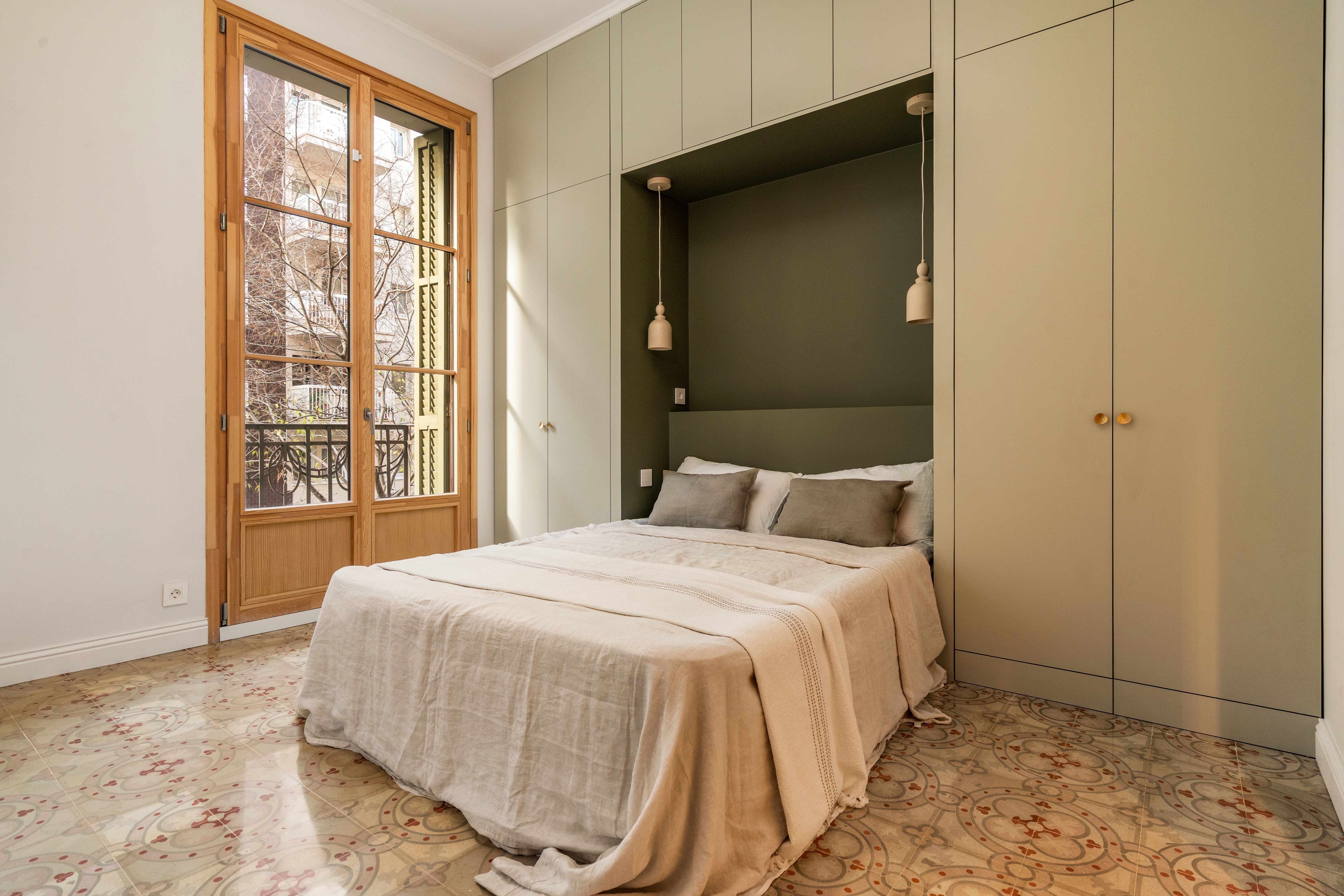 La vivienda, completamente renovada a estrenar, conserva el carácter clásico propio de las fincas regias de los años 20, gracias a los suelos hidráulicos originales recuperados, los techos de 3.40 cm con bóveda catalana, los suelos de madera en espiga y a los grandes ventanales típicos de l’Eixample, ahora con doble acristalamiento, que aportan personalidad y elegancia.