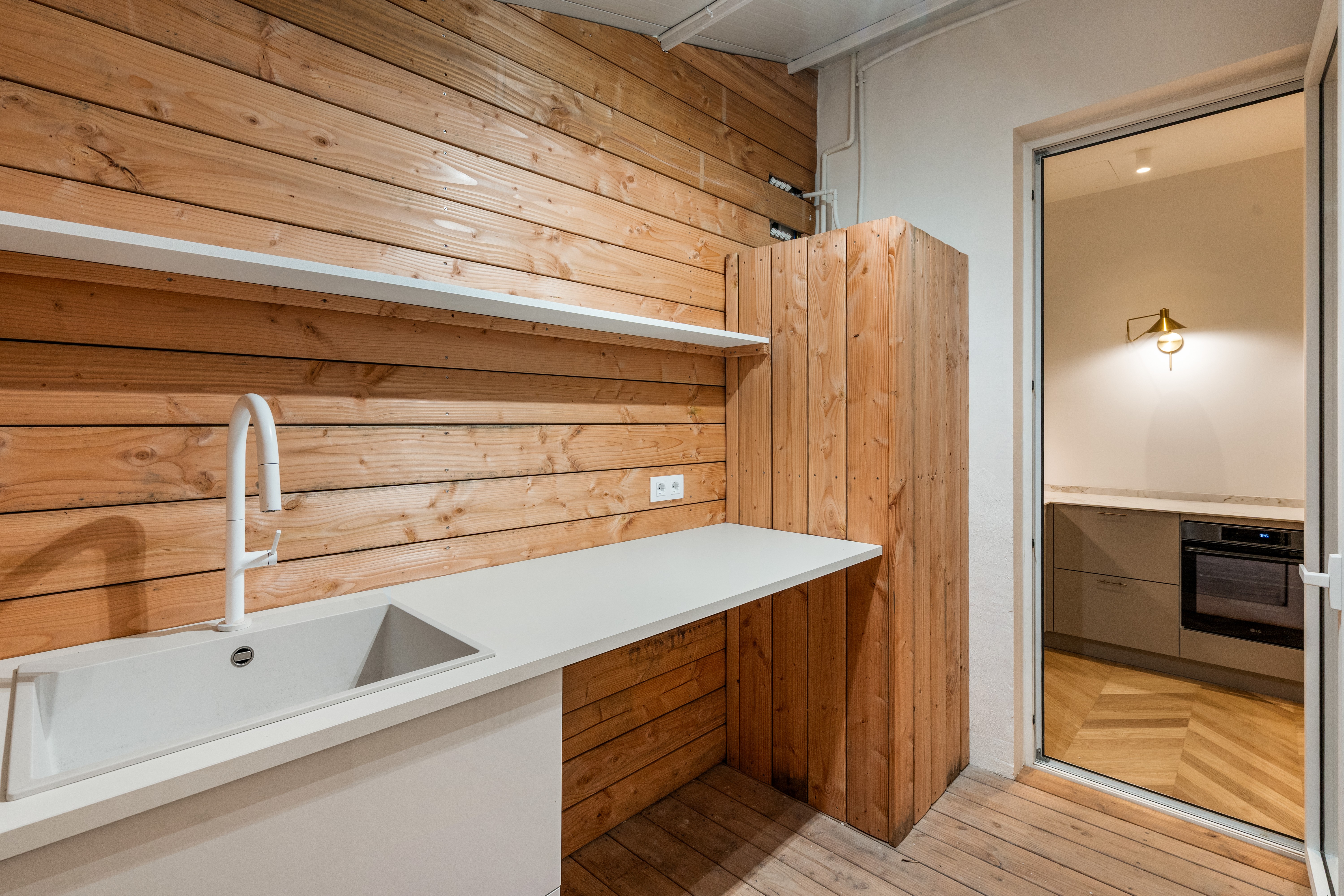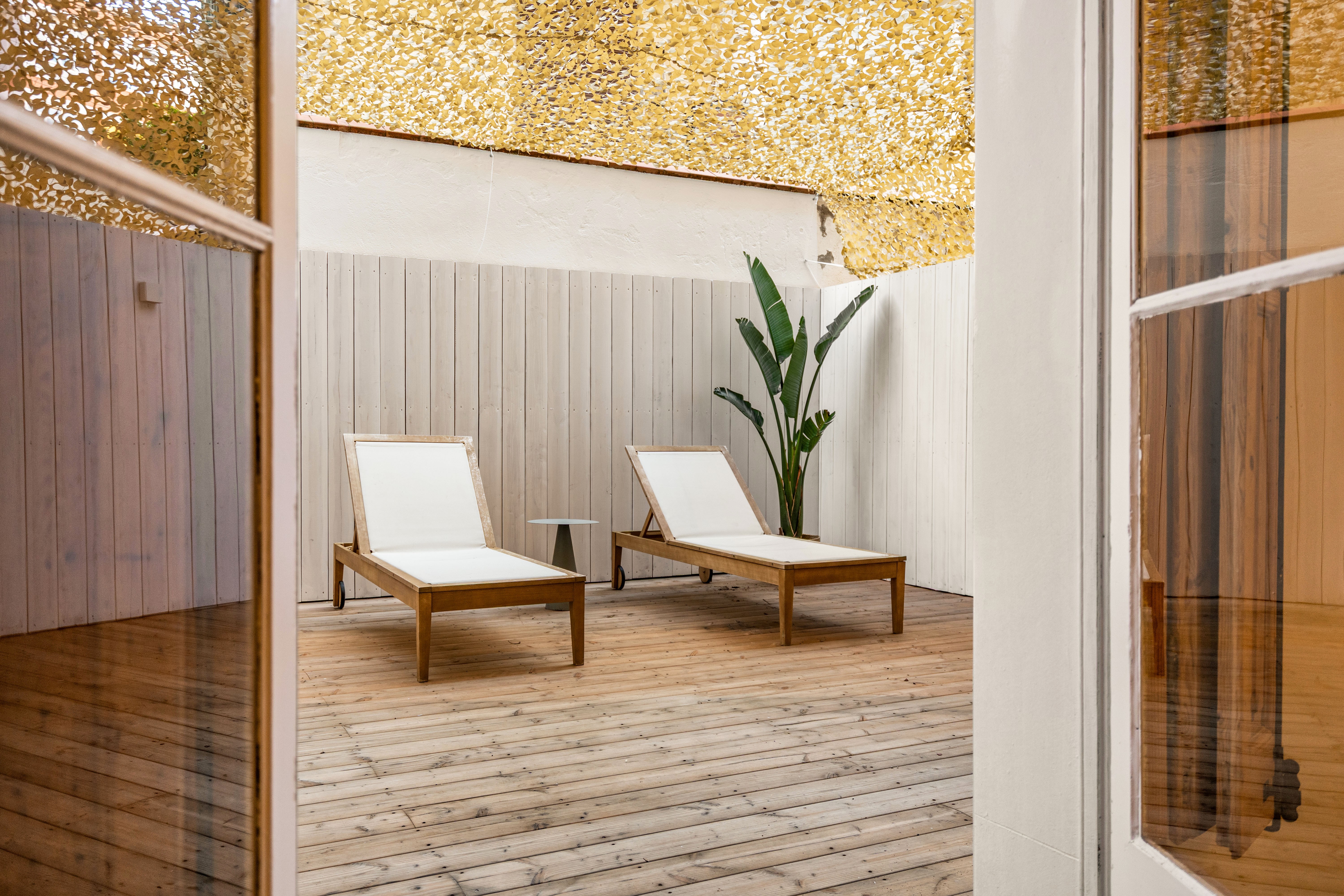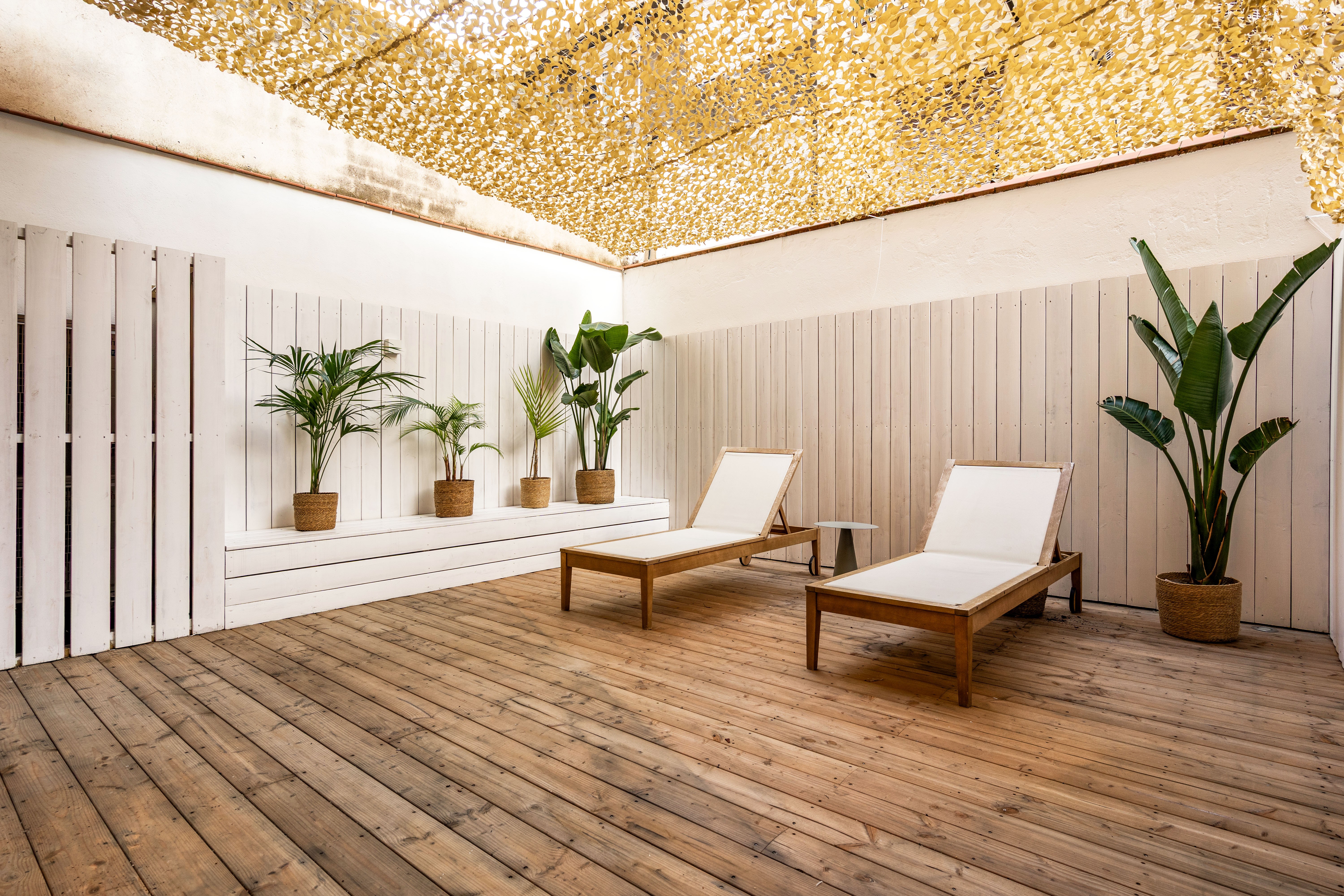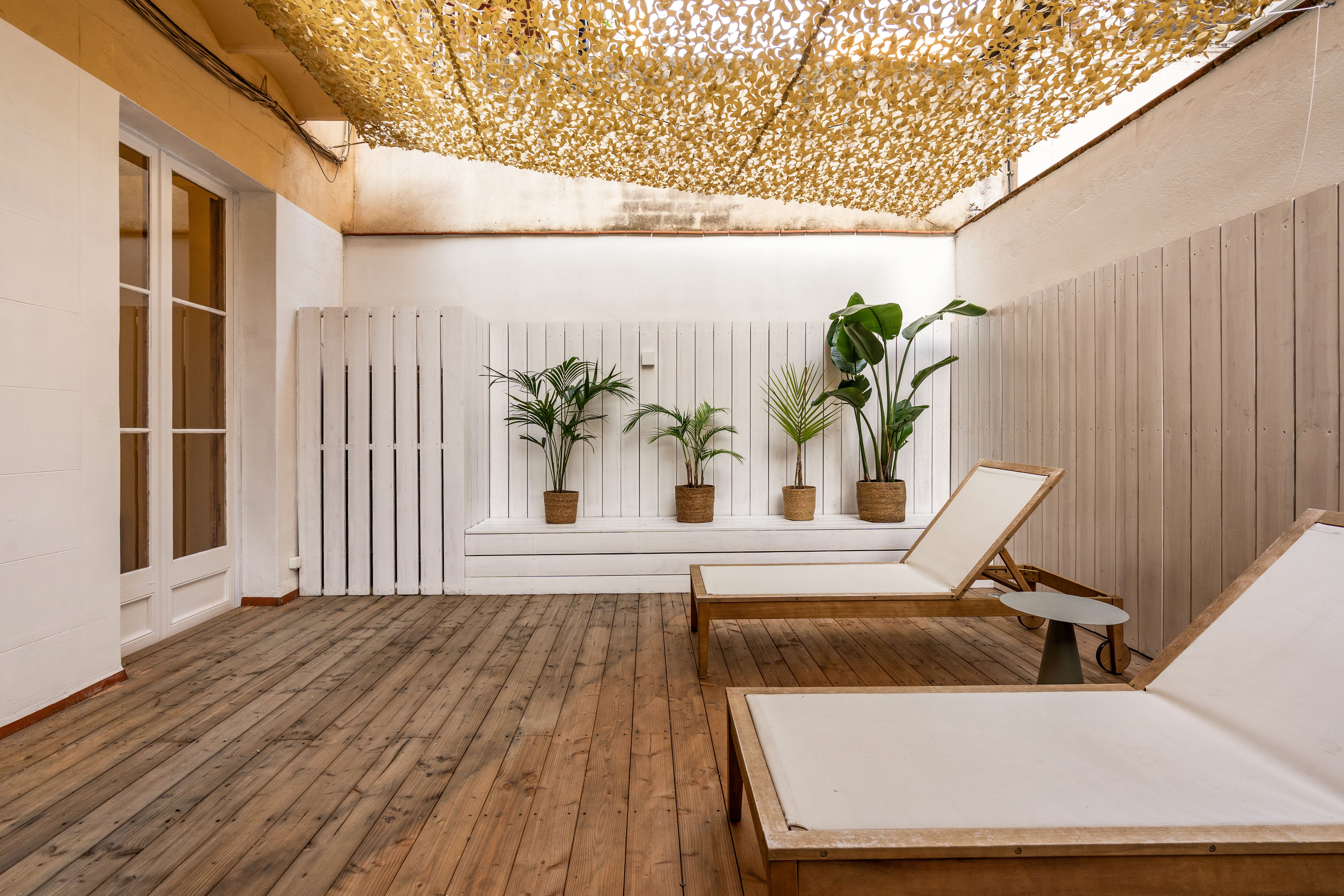 Sumérgete en esta pieza única donde podrás desayunar y tomar el vermuth con amigos en su preciosa terraza de madera natural de 25m2 a la que se accede directamente desde el salón.
