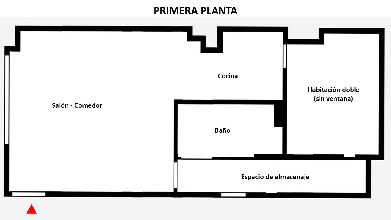 En la primera planta se encuentra un amplio y luminoso salón-comedor con cocina abierta y un gran ventanal con vistas despejadas a la calle, que aporta muchísima luz natural. Esta primera planta también ofrece una habitación doble (sin ventana), un baño completo y un espacio de almacenaje ideal como trastero.